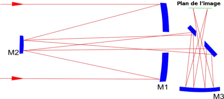 Chemin optique d'un télescope Korsch : miroirs primaires (M1), secondaire (M2) et tertiaire (M3).