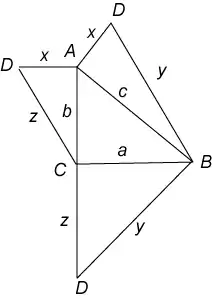 Avec les notations du patron ci-contre, les longueurs a,b,c,x, étant choisies, les longueurs y,z sont obtenues par les relations .