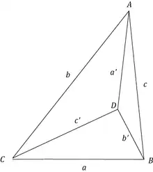 Si sont les longueurs des arêtes issues d'un même sommet, et les mesures des angles des faces arrivant à ce sommet, on a la formule, obtenue en 1752 par Euler[8],[9] :