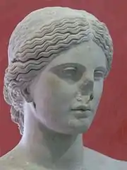 En dehors de la qualité plastique « exceptionnelle » que l'on peut reconnaître à ce buste[11], l'étude de la tête (photo), marquée par une coiffure de tresses en bandeaux réunies en chignon bas, particulièrement stricte, des traits réguliers, un bas de visage lourd et une partie orbitale fortement ombrée, laisse apparaître des similitudes avec les statues grecques de la fin du Ve ou du début du IVe siècle av. J.-C., vraisemblablement pré-praxitélienne selon Cécile Carrier[12], rejoignant en cela Salomon Reinach[13], bien que certains auteurs comme Antonio Corso associent ce buste à la Phryné de la triade de Thespies sculptée par Praxitèle[14].