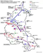 Le TER Champagne-Ardenne est le réseau transport express régional de l'ancienne région administrative Champagne-Ardenne. Il a représenté, en 2010, environ 10 000 voyages quotidiens effectués sur 1 057 km de voies ferrées avec 80 gares et points d'arrêt, réalisés au moyen de 250 circulations de trains (TER et Intercités) et 80 circulations d'autocars[1]. Le réseau propose onze liaisons ferroviaires et quatorze liaisons routières conventionnées par la région. La production est assurée par 52 autorails ou automotrices et cinq rames tractées[1]. Selon les chiffres de la sncf, en 2014, 93,48 % des circulations étaient ponctuelles ou arrivaient à destination avec un retard ne dépassant pas cinq minutes[1]. Quatre lignes sont certifiées « NF service » sur la base de la norme EN 13816 délivré par Afnor.