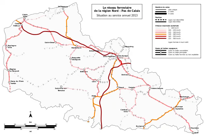 Avec 1 430 kilomètres de lignes[2] (dont la LGV Nord qui relie Arras à Calais en passant par Lille), soit 115 mètres de lignes par km², le TER Nord-Pas-de-Calais représente le réseau le plus dense d'une région française, après l'Île-de-France[9]. On compte 203 gares et points d'arrêts : 121 dans le Nord et 82 dans le Pas-de-Calais. La région est sillonnée par les TGV, Intercités, TERGV, TER, ces deux derniers étant à classe unique.