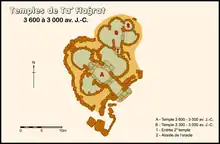 Le premier temple trilobé, orienté sud-est / nord-ouest, fait 18 x 16 m. Il est daté de 3600 - Le deuxième temple, doté de quatre absides, orienté sud / nord, est plus petit. Il fait 10 x 8 m, et est daté de 3300 - Son entrée n'est pas extérieure, elle donne dans l'abside est du premier.