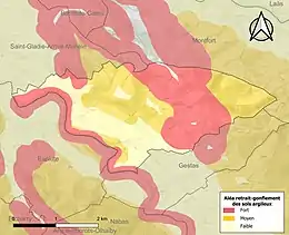 Le retrait-gonflement des sols argileux est susceptible d'engendrer des dommages importants aux bâtiments en cas d’alternance de périodes de sécheresse et de pluie[31]. 76,6 % de la superficie communale est en aléa moyen ou fort (59 % au niveau départemental et 48,5 % au niveau national)[Carte 5]. Depuis le , en application de la loi ELAN, différentes contraintes s'imposent aux vendeurs, maîtres d'ouvrages ou constructeurs de biens situés dans une zone classée en aléa moyen ou fort[Note 6],[32].