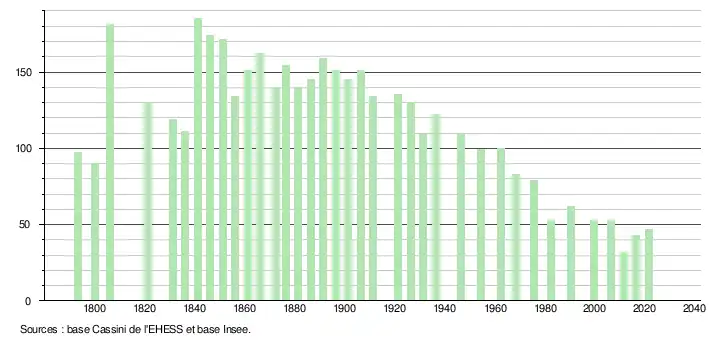 L'évolution du nombre d'habitants est connue à travers les recensements de la population effectués dans la commune depuis 1793. Pour les communes de moins de 10 000 habitants, une enquête de recensement portant sur toute la population est réalisée tous les cinq ans, les populations légales des années intermédiaires étant quant à elles estimées par interpolation ou extrapolation[42]. Pour la commune, le premier recensement exhaustif entrant dans le cadre du nouveau dispositif a été réalisé en 2006[43].