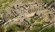 - arabe : tall al-ḥuṣn, تل الحصن, Ne pas confondre avec Qala`a al-Hosn (arabe : qalaʿa al-ḥiṣn, ou qalaʿa al-ḥuṣn, قلعة الحصن, Le château de la citadelle) nom du Krak des Chevaliers situé 250 km plus au Nord en Syrie et aussi un des noms donnés au site d'Hippos : Le château des chevaux (arabe : ḥiṣān, حصان ; pl. ḥuṣn, حصن, cheval ; chevaux) autre ville de la Décapole situé 50 km plus au Nord au rebord du plateau du Golan.