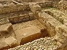 La coupe profonde de la terrasse principale a révélé la présence de murailles de pierres et de briques de terre séchée ayant jusqu’à cinq mètres d’épaisseur. Les murs de briques du bronze moyen sont encore visibles dans la partie accessible de la terrasse.