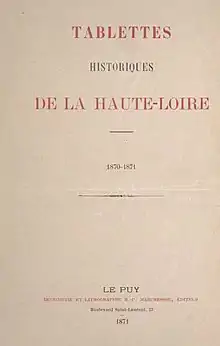 Les Tablettes historiques de la Haute-Loire est un mensuel fondé le [2] au Puy-en-Velay qui prit le nom de Tablettes historiques du Velay en [3] et qui parut jusqu'en [4],[5].