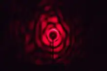 Récemment, une tache de Fresnel a pu être produite avec un jet supersonique de molécules de deutérium (qui sont des ondes de matière[21] électriquement neutres). On sait par la mécanique quantique que les particules matérielles peuvent se comporter comme des ondes. La nature ondulatoire des particules remonte aux théories de hypothèse de de Broglie[22] et à l'expérience de Davisson et Germer[23]. On peut observer des taches de diffraction d'électrons, qui sont un type d'ondes de matière, en microscopie à transmission électronique lorsque l'on examine des structures circulaires d'une certaine taille.