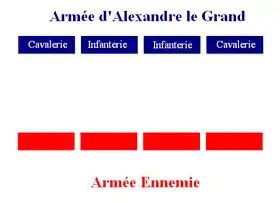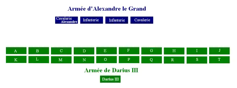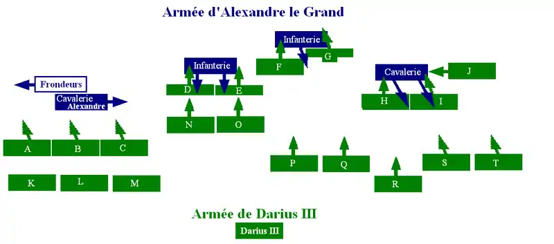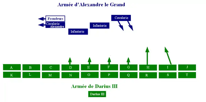 Afin de ne pas se faire encercler par l'innombrable cavalerie perse, Alexandre décide de disposer ses troupes en échelons. C'est un dispositif totalement innovant pour l'Antiquité. Alexandre prend la tête de la cavalerie des Compagnons sur l'aile droite, tandis que Darius III reste au centre, au milieu de ses troupes. Afin d'occuper le maximum de terrain, Alexandre décide de partir loin sur son flanc droit. Il s'avance au trot pour être suivi de près par ses bataillons de tirailleurs d'élite (hommes à pieds équipés de frondes ou de lances à courte portée) qu'il dispose en soutien. Il se débrouille ainsi pour masquer leur présence à la vue de l'armée perse. Les phalangites et les cavaliers thessaliens et thraces, qui tiennent l'aile gauche sous le commandement de Parménion, ont pour mission de maintenir le plus longtemps possible leurs positions.