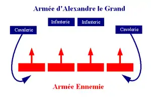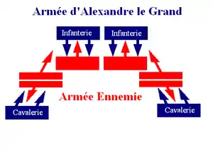 Attaquées par l'arrière, les troupes adverses sont surprises par la rapidité et la force d'impact de la cavalerie macédonienne ; au centre la phalange et les hypaspistes s'avancent pour ouvrir le deuxième front. Une fois encerclée, l'armée adverse est prise au piège. Généralement, il règne une grande confusion au sein de cette dernière car ses unités sont dispersées ou mal coordonnées.