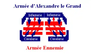 Pour attirer les forces adverses loin de leur centre, la cavalerie macédonienne contourne les flancs adverses, systématiquement par le flanc droit commandé par Alexandre en personne, puis elle tente de se placer à l'arrière des troupes adverses, les obligeant ainsi à se regrouper.