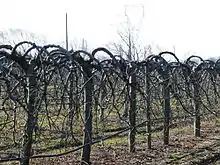 - Le Solaxe : Lespinasse propose alors, en 1990, le « Solaxe » (Solen + Axe), un mélange des deux premières techniques. On laisse pousser l'axe sans jamais le tailler mais en le maintenant toujours à l'horizontale par arcure.