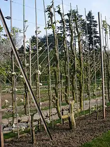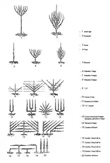 - Formes en espalier (ou plates, palissées, dirigées ou en palmettes) : haie, palmette (conduite contre un mur en horizontal, vertical ou oblique), contre-espalier (palmette conduite sans mur mais avec treillis), palissage en V (tatura), candélabre, drapeau, cordon[3]. Ce sont des formes anciennes de moins en moins utilisées car elles ne sont pas naturelles et réclament beaucoup d'entretien et d'expertise[4].
