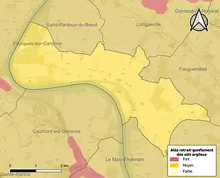 Le retrait-gonflement des sols argileux est susceptible d'engendrer des dommages importants aux bâtiments en cas d’alternance de périodes de sécheresse et de pluie[21]. La totalité de la commune est en aléa moyen ou fort (91,8 % au niveau départemental et 48,5 % au niveau national)[Carte 2]. Depuis le , en application de la loi ELAN, différentes contraintes s'imposent aux vendeurs, maîtres d'ouvrages ou constructeurs de biens situés dans une zone classée en aléa moyen ou fort[Note 4],[22].