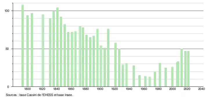 L'évolution du nombre d'habitants est connue à travers les recensements de la population effectués dans la commune depuis 1793. Pour les communes de moins de 10 000 habitants, une enquête de recensement portant sur toute la population est réalisée tous les cinq ans, les populations légales des années intermédiaires étant quant à elles estimées par interpolation ou extrapolation[17]. Pour la commune, le premier recensement exhaustif entrant dans le cadre du nouveau dispositif a été réalisé en 2007[18].