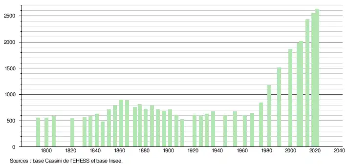 L'évolution du nombre d'habitants est connue à travers les recensements de la population effectués dans la commune depuis 1793. Pour les communes de moins de 10 000 habitants, une enquête de recensement portant sur toute la population est réalisée tous les cinq ans, les populations légales des années intermédiaires étant quant à elles estimées par interpolation ou extrapolation[16]. Pour la commune, le premier recensement exhaustif entrant dans le cadre du nouveau dispositif a été réalisé en 2008[17].
