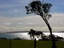 Photographie du détroit de Tamaki et de l'île de Waiheke, prise depuis Beachlands.