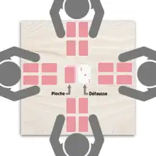Chaque joueur reçoit 4 cartes qu'il dispose devant lui en carré et face cachée. Le reste des cartes constitue la pile. Chaque joueur prend ensuite connaissance des deux premières cartes devant lui.