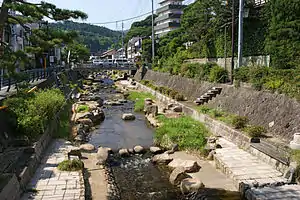 Les rives de la rivière Tamayu qui traverse Tamatsukuri onsen ont été aménagées en bains ouverts et les passants peuvent profiter à loisir des bienfaits de cette rivière qui se déverse dans le lac Shinji. Plus de quatre cents cerisiers (en japonais : sakura no ki) bordent cette rivière et leur floraison en mars-avril est très attendue (voir hanami).