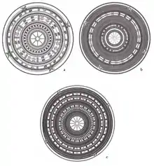 - Géométriques : sur l'ensemble orné du tambour, des brisures et des angles permettent de combler tous les vides entre des motifs plus élaborés : par exemple des spirales qui ont pu représenter des eaux-vives. La plupart de ces formes recoupent celles de céramiques antérieures.