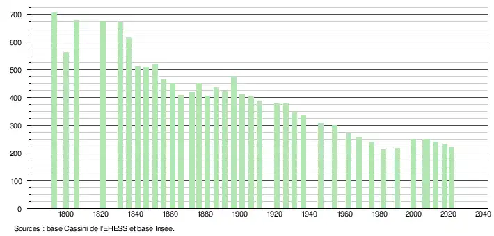 L'évolution du nombre d'habitants est connue à travers les recensements de la population effectués dans la commune depuis 1793. Pour les communes de moins de 10 000 habitants, une enquête de recensement portant sur toute la population est réalisée tous les cinq ans, les populations légales des années intermédiaires étant quant à elles estimées par interpolation ou extrapolation[13]. Pour la commune, le premier recensement exhaustif entrant dans le cadre du nouveau dispositif a été réalisé en 2007[14].