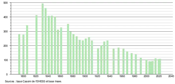 L'évolution du nombre d'habitants est connue à travers les recensements de la population effectués dans la commune depuis 1793. Pour les communes de moins de 10 000 habitants, une enquête de recensement portant sur toute la population est réalisée tous les cinq ans, les populations légales des années intermédiaires étant quant à elles estimées par interpolation ou extrapolation[16]. Pour la commune, le premier recensement exhaustif entrant dans le cadre du nouveau dispositif a été réalisé en 2004[17].