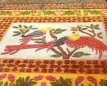 La plupart des tapis traditionnels commencent par une couche de sciure de bois non teintée répartie dans un cadre en bois pour lisser les surfaces rugueuses telles que les rues pavées, puis aspergée d’une légère couche d’eau. Parfois, d'autres matériaux tels que le sable sont utilisés pour la base. Ensuite, les dessins sont posés dessus[1],[2]. Sur les rues lisses et autres surfaces, le dessin peut être fait à la craie et rempli avec les matières à colorier[3]. Il existe deux manières de créer le motif, en utilisant des moules ou des pochoirs et en travaillant à main levée, en saupoudrant et en plaçant le matériau coloré. Le traitement à main levée prend plus de temps et nécessite plus de savoir-faire avec l'utilisation de moules permettant des conceptions très définies et complexes. Une fois le tapis terminé, il reçoit un très léger jet d’eau pour fixer la sciure de bois et empêcher la décoloration des couleurs[1].