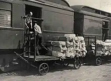 Des sacs de courrier sur tapissière sont chargés sur un Post Office du chemin de fer (RPO) en 1925.