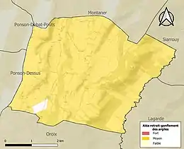 Le retrait-gonflement des sols argileux est susceptible d'engendrer des dommages importants aux bâtiments en cas d’alternance de périodes de sécheresse et de pluie. 98,6 % de la superficie communale est en aléa moyen ou fort (44,5 % au niveau départemental et 48,5 % au niveau national). Sur les 109 bâtiments dénombrés sur la commune en 2019, 109 sont en aléa moyen ou fort, soit 100 %, à comparer aux 75 % au niveau départemental et 54 % au niveau national. Une cartographie de l'exposition du territoire national au retrait gonflement des sols argileux est disponible sur le site du BRGM[25],[Carte 3].