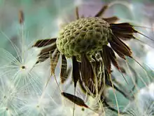 Les fruits sont des akènes grisâtres, petits (environ 1 500 au gramme), oblongs, cylindracés[11], munis de côtes muriquées et épineuses[12]. Ils sont surmontés d'un pappus à soies simples disposées sur deux rangs, organe d'anémochorie qui permet une dispersion transocéanique des graines par le vent, ce qui favorise la spéciation allopatrique[13].