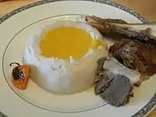 Il se compose de taro pilé jusqu'à obtenir une pâte grisâtre, ainsi que d'une sauce jaune à base d'huile de palme, de champignons, de viande et d'épices. Ce plat est ensuite dégusté avec les doigts[1],[2].