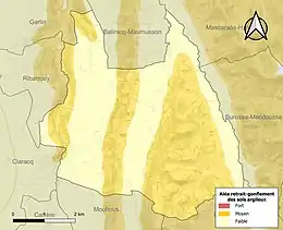 Le retrait-gonflement des sols argileux est susceptible d'engendrer des dommages importants aux bâtiments en cas d’alternance de périodes de sécheresse et de pluie[30]. 53,5 % de la superficie communale est en aléa moyen ou fort (59 % au niveau départemental et 48,5 % au niveau national)[Carte 3]. Depuis le , en application de la loi ELAN, différentes contraintes s'imposent aux vendeurs, maîtres d'ouvrages ou constructeurs de biens situés dans une zone classée en aléa moyen ou fort[Note 5],[31].
