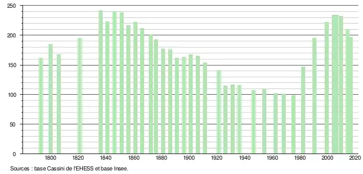 L'évolution du nombre d'habitants est connue à travers les recensements de la population effectués dans la commune depuis 1793. Pour les communes de moins de 10 000 habitants, une enquête de recensement portant sur toute la population est réalisée tous les cinq ans, les populations légales des années intermédiaires étant quant à elles estimées par interpolation ou extrapolation[2]. Pour la commune, le premier recensement exhaustif entrant dans le cadre du nouveau dispositif a été réalisé en 2004[3].