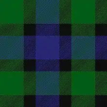 Clan Campbell (Black Watch) : bande verte chargée d'un filet bleu, bande bleu chargée alternativement d'un double filet et de deux doubles filets (fausse symétrie).