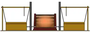 Dans sa dernière évolution, le fourneau ressemble à une grande baignoire rectangulaire d’environ 2,70 m de long sur 90 cm de large et d’une hauteur de 0,9 à 1,2 m pour la fabrication de l'acier, mais pouvant monter jusqu'à 1,6 m pour la fabrication de la fonte blanche[note 1]. La base du fourneau est, sur ses deux côtés les plus longs, criblée d’une vingtaine de trous dans lesquels s’emboîtent des tuyères métalliques permettant d’insuffler l’air propulsé par des soufflets. Un ou plusieurs orifices de coulée permettent l'évacuation partielle du laitier. Afin d’assécher le soubassement, le fourneau est bâti sur une infrastructure souterraine complexe construite en pierre, bois et argile. Cette fondation sert plusieurs années, contrairement au four lui-même qui doit être reconstruit à chaque campagne (chacune dure de trois à quatre jours)[1].