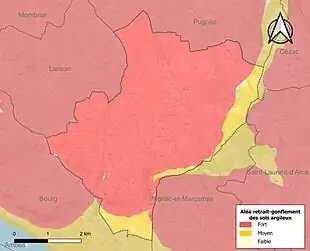 Le retrait-gonflement des sols argileux est susceptible d'engendrer des dommages importants aux bâtiments en cas d’alternance de périodes de sécheresse et de pluie. 99,7 % de la superficie communale est en aléa moyen ou fort (67,4 % au niveau départemental et 48,5 % au niveau national). Sur les 609 bâtiments dénombrés sur la commune en 2019, 607 sont en aléa moyen ou fort, soit 100 %, à comparer aux 84 % au niveau départemental et 54 % au niveau national. Une cartographie de l'exposition du territoire national au retrait gonflement des sols argileux est disponible sur le site du BRGM[19],[Carte 2].