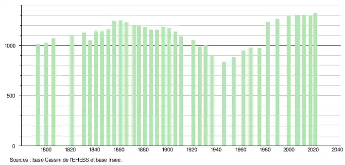 L'évolution du nombre d'habitants est connue à travers les recensements de la population effectués dans la commune depuis 1793. Pour les communes de moins de 10 000 habitants, une enquête de recensement portant sur toute la population est réalisée tous les cinq ans, les populations légales des années intermédiaires étant quant à elles estimées par interpolation ou extrapolation[21]. Pour la commune, le premier recensement exhaustif entrant dans le cadre du nouveau dispositif a été réalisé en 2007[22].
