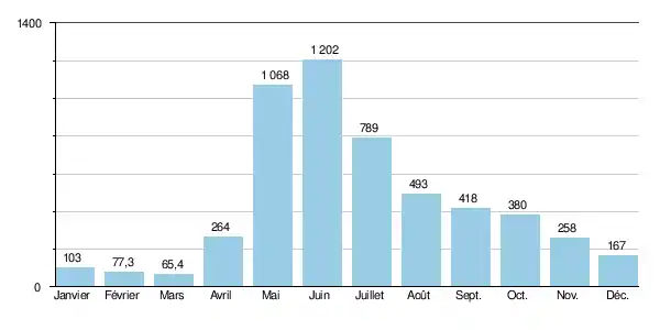 En ce qui concerne la période estivale, la seule utile car libre de glaces (de mai à septembre inclus), le débit mensuel minimum observé a été de 112 m3/s en .