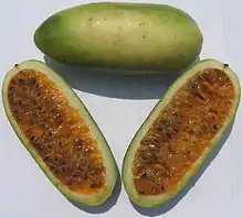Il ressemble à une petite banane aux extrémités arrondies. Plusieurs espèces de passiflores produisent le taxo :