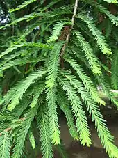 Les feuilles disposées en spirale sur les rameaux sont tordues à la base, ce qui les fait apparaître en deux rangées opposées dans le même plan horizontal. Elles mesurent de 1 à 2 cm de long sur 1 à 2 mm de large.