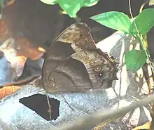 Le revers est marron avec une teinte rougeâtre de la bande submarginale ornée d'une ligne d'ocelles, discrets à l'aile antérieure, mieux visibles à l'aile postérieures avec celui proche de l'angle anal noir pupillé de blanc[3].