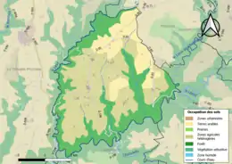 L'occupation des sols de la commune, telle qu'elle ressort de la base de données européenne d’occupation biophysique des sols Corine Land Cover (CLC), est marquée par l'importance des territoires agricoles (63,1 % en 2018), une proportion sensiblement équivalente à celle de 1990 (63,1 %). La répartition détaillée en 2018 est la suivante : zones agricoles hétérogènes (45,1 %), forêts (36,9 %), terres arables (18 %)[23].