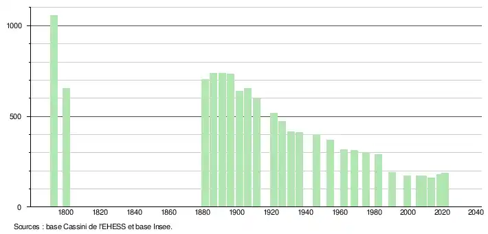 L'évolution du nombre d'habitants est connue à travers les recensements de la population effectués dans la commune depuis 1793. Pour les communes de moins de 10 000 habitants, une enquête de recensement portant sur toute la population est réalisée tous les cinq ans, les populations légales des années intermédiaires étant quant à elles estimées par interpolation ou extrapolation[45]. Pour la commune, le premier recensement exhaustif entrant dans le cadre du nouveau dispositif a été réalisé en 2008[46].