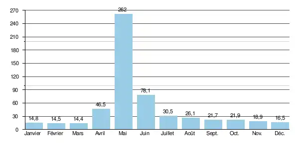 Le débit moyen mensuel observé en mars (minimum d'étiage) est de 14,4 m3/s, soit seulement 5,5 % du débit moyen du mois de mai (262 m3/s), ce qui souligne l'amplitude élevée des variations saisonnières. Sur la durée d'observation de 32 ans, le débit mensuel minimal a été de 8,7 m3/s en , tandis que le débit mensuel maximal s'élevait à 578 m3/s en . Un débit mensuel inférieur à 9,0 m3/s est exceptionnel.