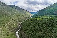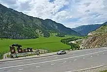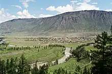 Village à droite vu depuis une colline avec la rivière Tchouïa en premier plan | |||