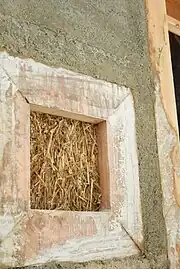 - Le mortier : Il est issu des recherches sur le bois cordé[19]. Il est composé de sable (3 volumes), de sciure de bois (4 volumes), de chaux aérienne (1 volume) et de ciment (1 volume) il est versé dans l'espace entre la paille et le coffrage. Il est ensuite vibré manuellement.