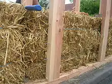 - La paille : Elle assure les fonctions d'isolant thermique et de support d'enduit. Elle participe dans une certaine mesure à la résistance mécanique de la paroi. Il s'agit d'une botte de paille de céréale (réglementairement de blé, en France) de moyenne densité (environ 80 kg/m3), saine et sèche et de dimension standard (36 x 46 cm, longueur indifférente). Les bottes sont insérées rang par rang, après chaque niveau de coulage, sur chant, en tunnel entre les 2 rangées de montants ou verticalement dans une colonne d'appui. Elles ne sont pas rentrées en force et, si nécessaire, elles seront retaillées à la longueur et à la forme souhaitée. Les espaces vides seront comblés de paille en vrac comprimée. La résistance thermique du mur est de R=7,11 (m2 ·K/W) (le lambda de la paille étant 0,052 W/(m.K)[18])