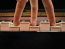 Lorsque l'on joue des pièces qui demandent de jouer des accords et des nuances fortes on placera son pied gauche sous le tabouret, sur les orteils de façon à pouvoir appuyer et donner de la force sans perdre l'équilibre et ainsi jouer aisément ces passages.