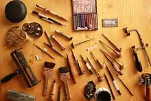 Gouges, pointe sèches, stylets, rouleau encreur, poupées, roulettes, pince-étaux et une boite de pastels